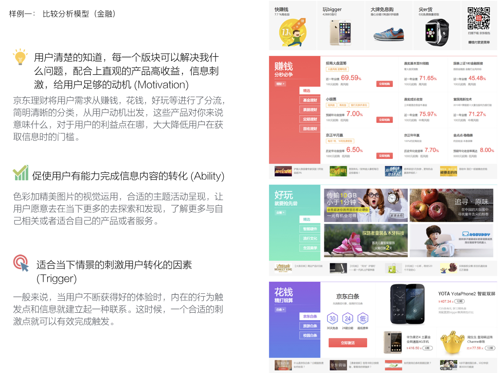 福格模型进行产品分析样例中的三段式分析基于有效探寻行为原因的“福格模型”。当一个具体的行为发生,必须同时具备三个元素:动机、能力和触发。